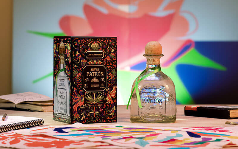 El audaz diseño del artista mexicano Smithe presenta dos estilos de bordado inconfundiblemente mexicanos, Tenango-Hidalgo y Mariachi, que se combinan con elementos que representan el proceso artesanal de Patrón.