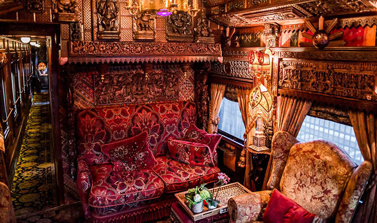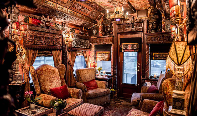 The train car is 85 feet long and equipped with a gourmet kitchen, dining room, three staterooms, and an observation room that’s filled with rare textiles and exotic wood carvings.
